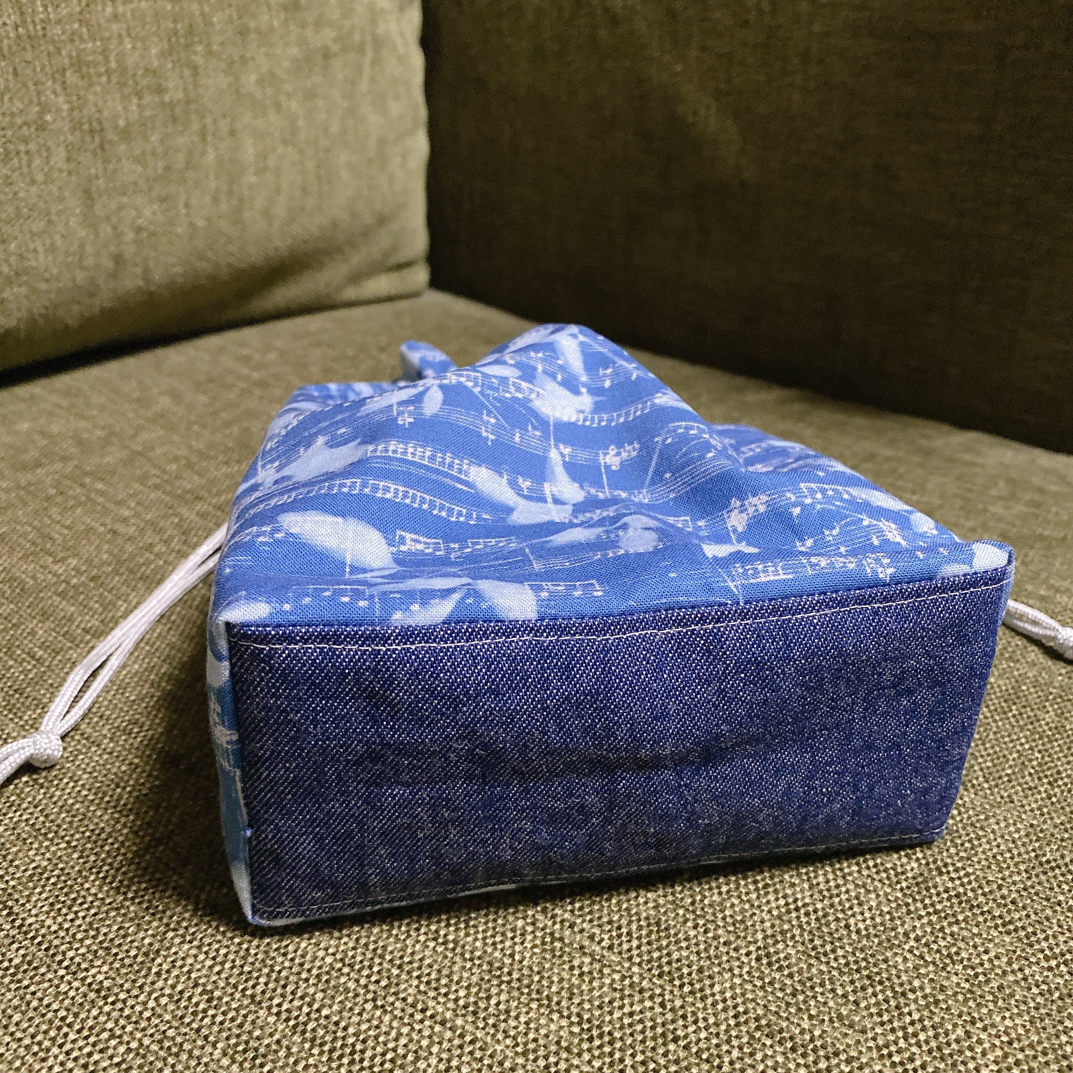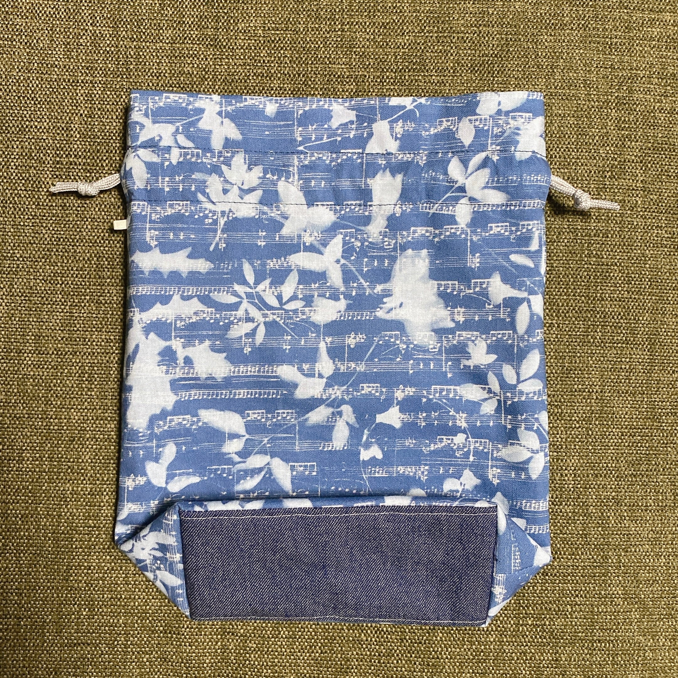 木漏れ日の下に見える古ぼけた楽譜という光景を写し取ったUSAコットンをメインに、ブルー系でまとめた巾着袋です。